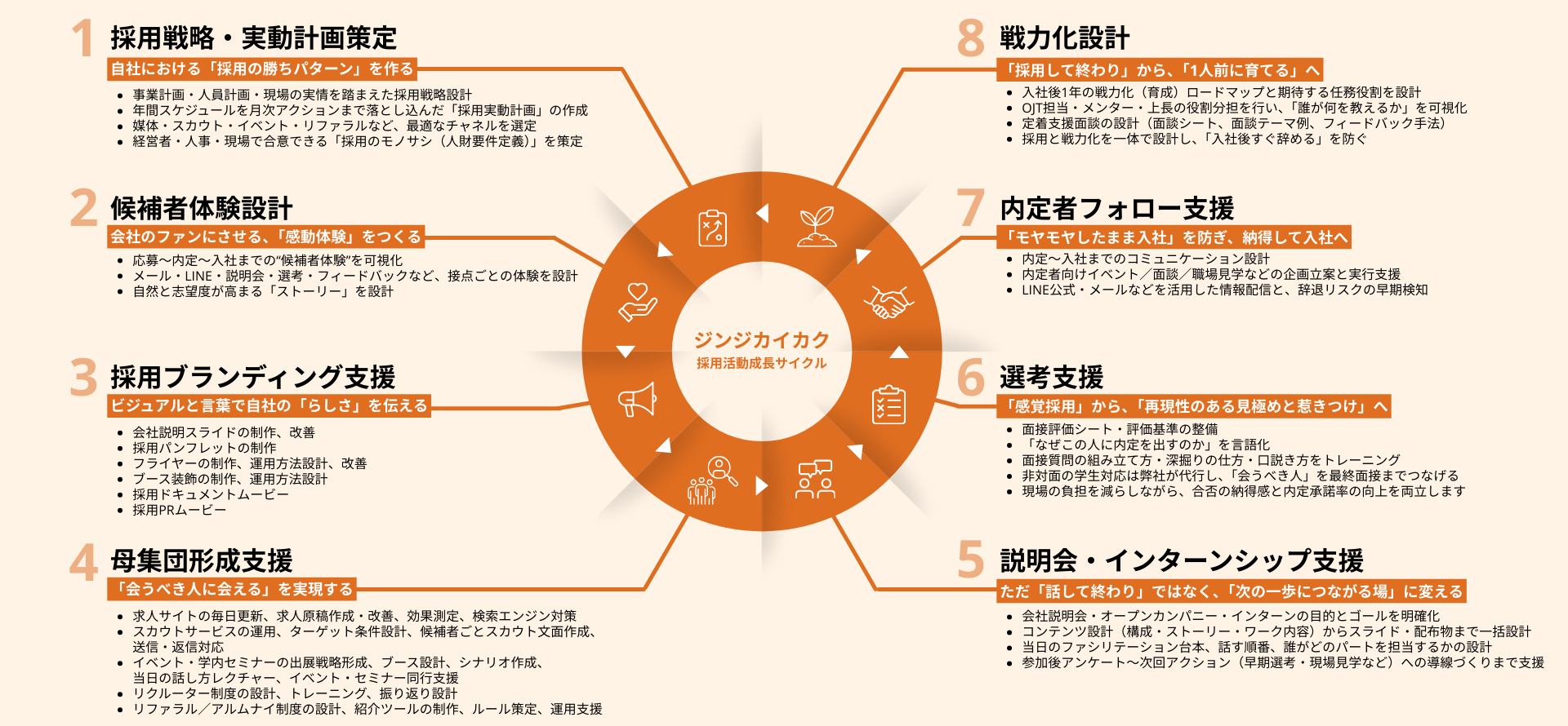 ジンジカイカクは、経営戦略に基づいた人事戦略の策定から現場レベルでのオペレーション展開を一気通貫で行い、